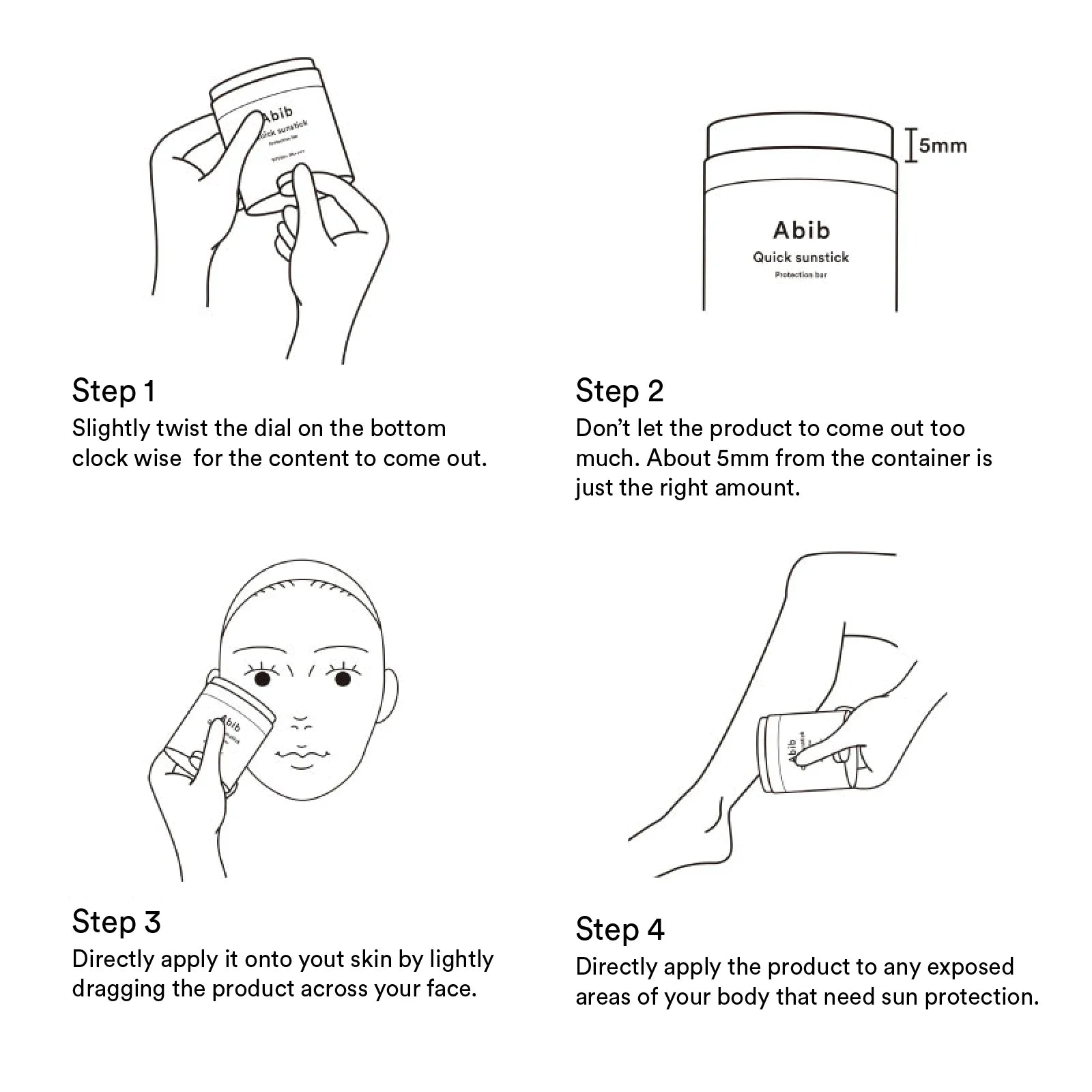 Directions: Roll out some substick with the dial at the bottom of the container. Directly apply onto skin that will be exposed to the sun, including face and body.